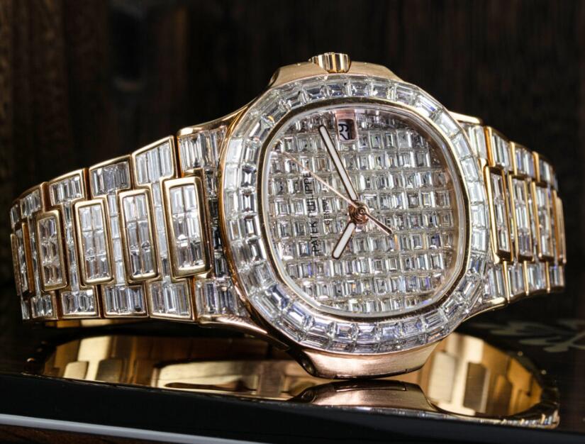 Powered by the Patek calibre 324 in-house self-winding movement, it offers a 45-hour power reserve. This particular piece has a bespoke aftermarket diamond-set case and bracelet.