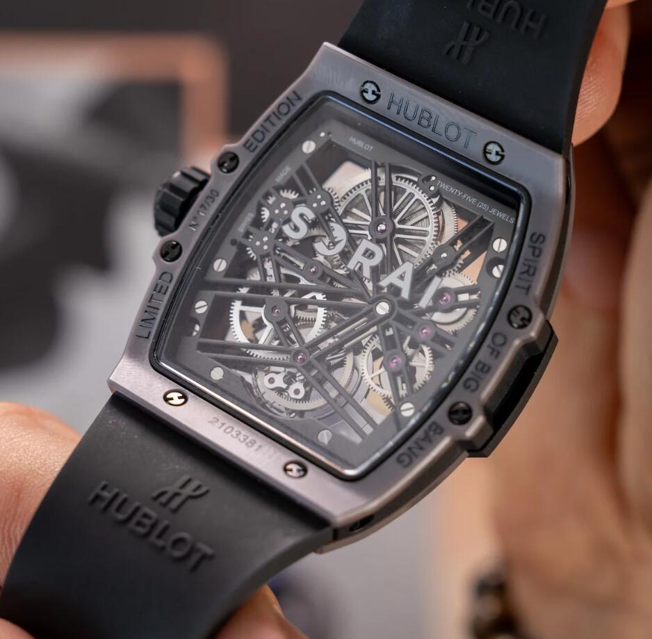 Sometimes collaboration cheap replica watches are very overt in style, but this limited edition Spirit of Big Bang is actually quite stealthy in nature. There is zero co-branding of the watch on its front side; it is only the caseback that reveals it is a numbered limited edition of 30 pieces with SORAI etched onto the movement-exhibiting sapphire crystal. Its 42mm case, 13.25mm thick and 30 metres water-resistant, is crafted in microblasted and polished grey ceramic, evocative of the colour of a Rhino and very robust in terms of scratch resistance. Although, unlike Rhinos, which weigh thousands of pounds, ceramic has the daily-wearer value-add of being very lightweight.