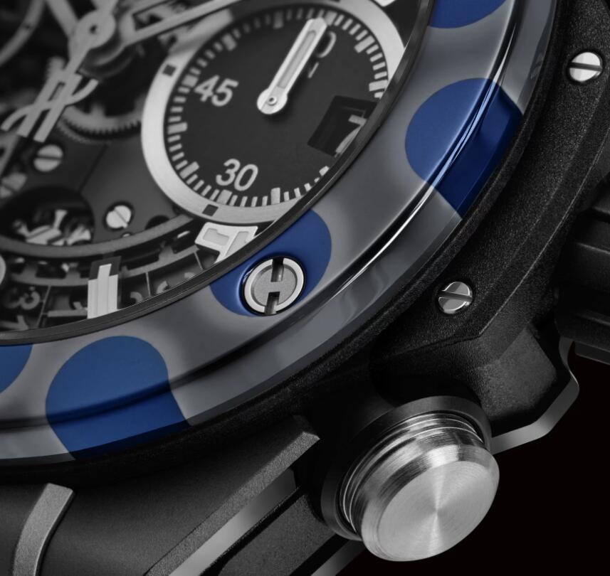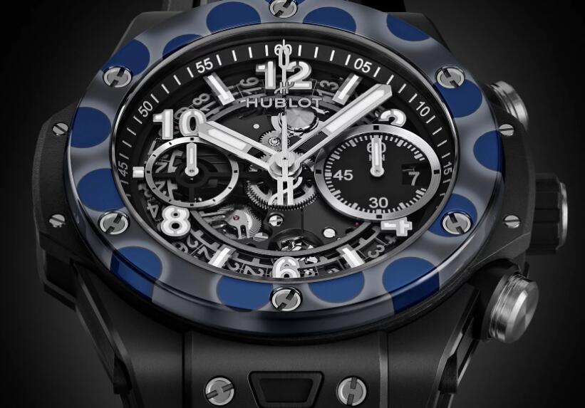 The new Magic Ceramic super clone watches for men adopts familiar Big Bang Unico dimensions with a 42mm diameter, and combines colours of dark grey and deep blue ceramic on the bezel with a sleek black ceramic midcase. It also echoes the recognisable Big Bang profile, with a circular bezel and six H-shaped screws. The 100-metre water-resistant case has a mix of micro-blasted and polished finishes, but it’s really the pattern of blue, Pop Art-like bubbles that stands out, although not in the usual, ultra-vivid Hublot way we may have come to expect.